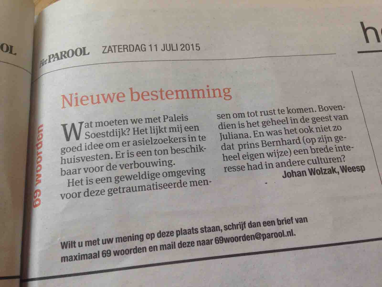In this little column in an Amsterdam local newspaper someone wonders whether or not the former Dutch royal palace in the village of Soestdijk can be used as a refugee camp. It's been empty for a while now.